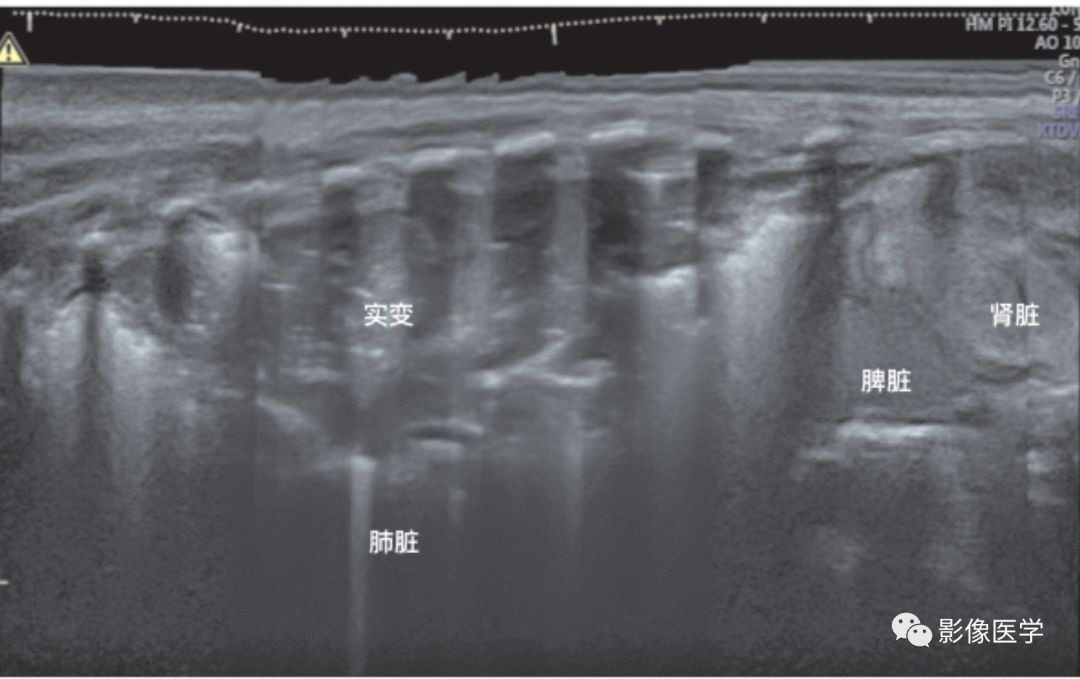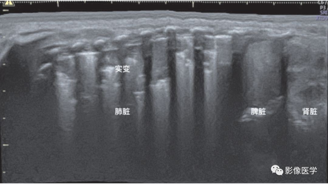 肺炎的超声表现(左肺肺炎)——宽景成像模式,依次显示肾脏、脾脏和肺脏。从超声影像上可以看出,几乎左肺在每个肋间均见明显实变伴支气管充气征,每个肋间受累的程度不同。