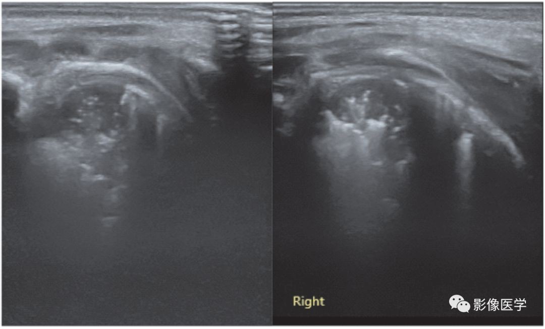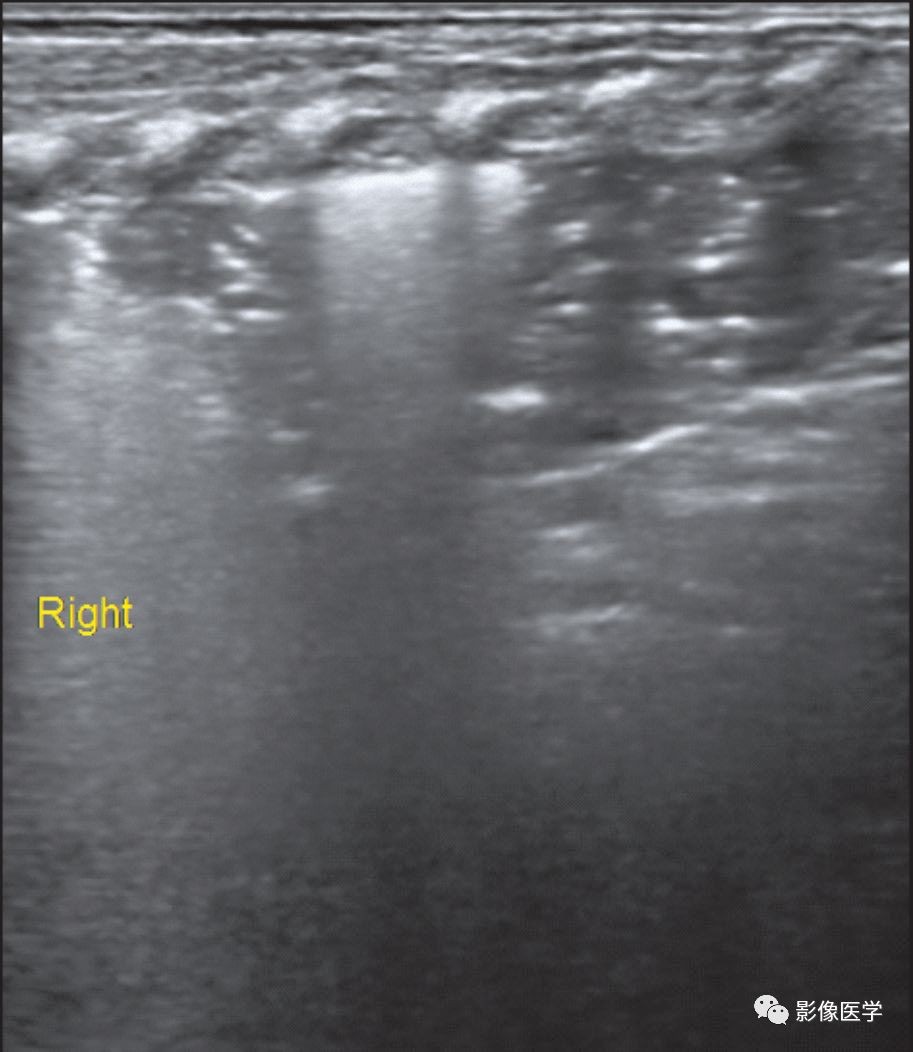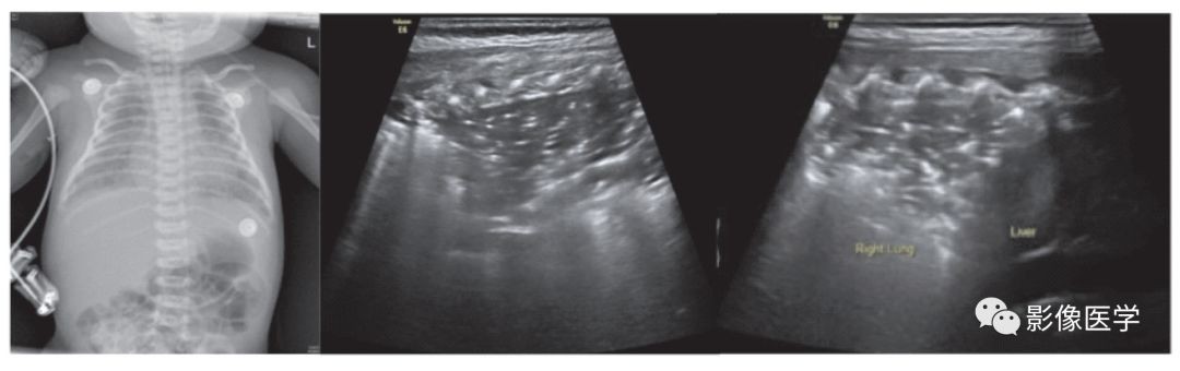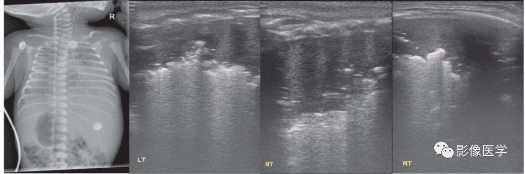 胎龄39周,自然分娩,出生体重3 990g。母产程中发热,体温38.6℃。婴儿出生后即呼吸困难,胸部X线检查显示双肺重症肺炎,透过度显著降低。肺脏超声显示双肺大面积实变,实变区肺组织充气基本消失,提示被累及的肺组织已完全不张,实变区边界不规则。中间两图为探头与肋骨垂直扫描,最右侧为(右侧肺脏)探头与肋骨平行扫描所见。
