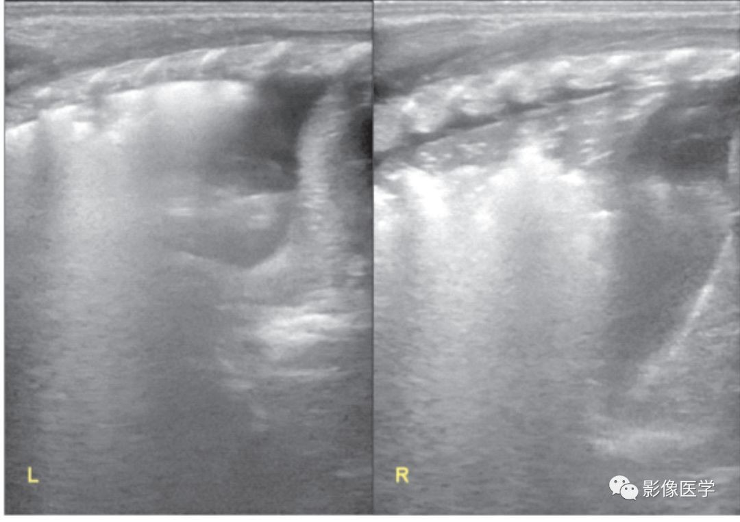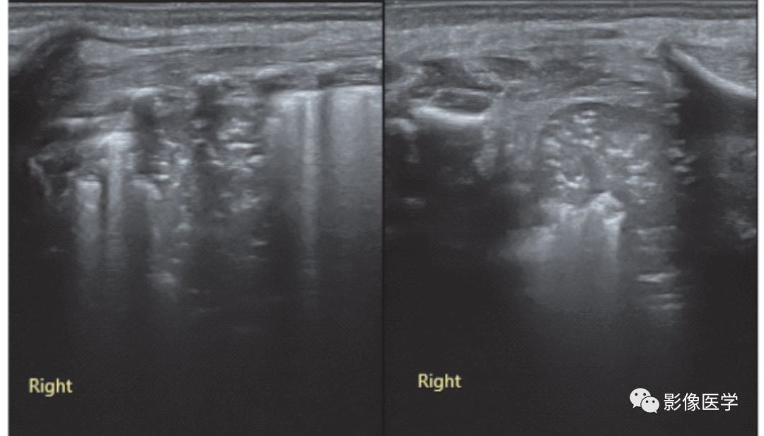 患儿,男,因RDS入院,给予呼吸机治疗。撤机后不久再次出现呼吸困难,伴发热及血常规异常。左图:肺脏超声探头与肋骨垂直扫描时显示累及多个肋间的实变伴支气管充气征,以肺中野两个肋间最为明显,已导致相应部位肺不张。右图:探头与肋骨平行扫描可见边界清晰的低回声实变区,即肺不张。