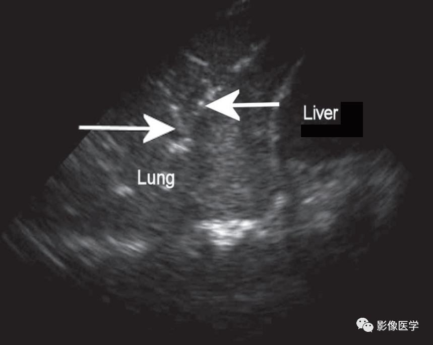 显示肺组织肝样变伴树枝状支气管充气征(箭头)[引自Blaivas M. Lung ultrasound inevaluation of pneumonia. J Ultrasound Med,2012,31(6):823-826]。