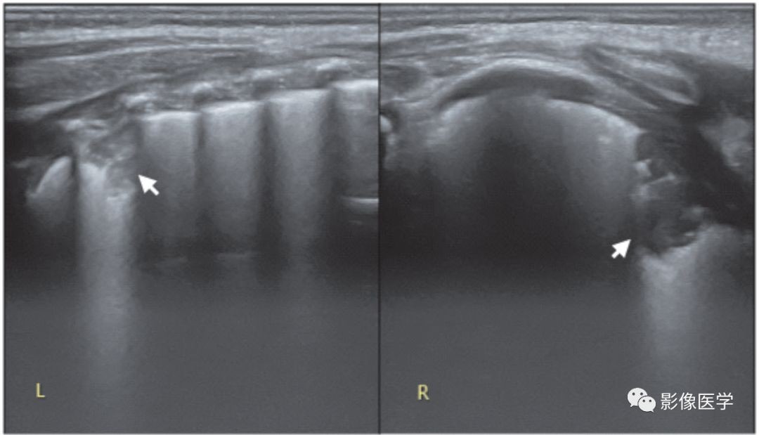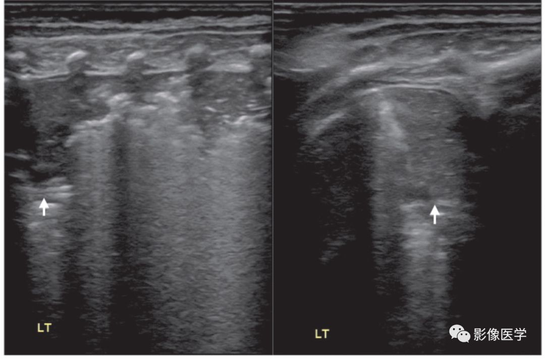 患儿,男,胎龄37周,剖宫产分娩。因呼吸困难入院,肺脏超声呈RDS改变[因宫内感染(WBC 28.8×109/L,N 86%,杆状核粒细胞比例17%,CRP 24mg/L,PCT 85ng/mL)继发RDS],给予呼吸机治疗。出生后第5天,肺脏超声显示左肺(左:探头与肋骨垂直扫描)、右肺(右:探头与肋骨平行扫描)各见累及1个肋间的肺实变(箭头所示),左肺可见支气管充气征;右肺实变程度较深,支气管内充气已被全部吸收,呈低回声实变区。