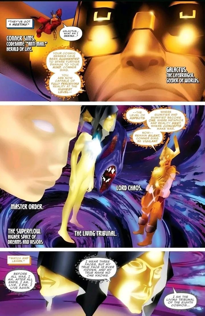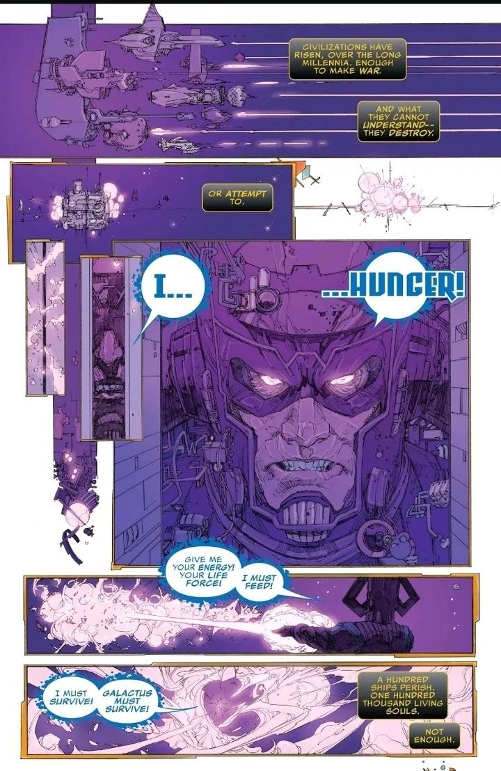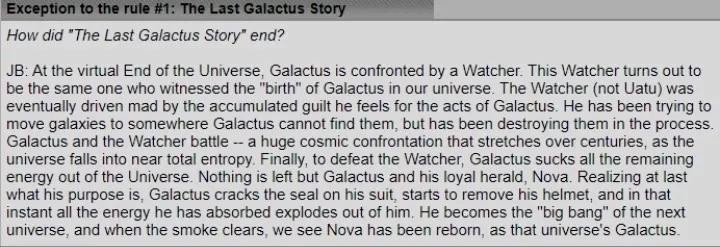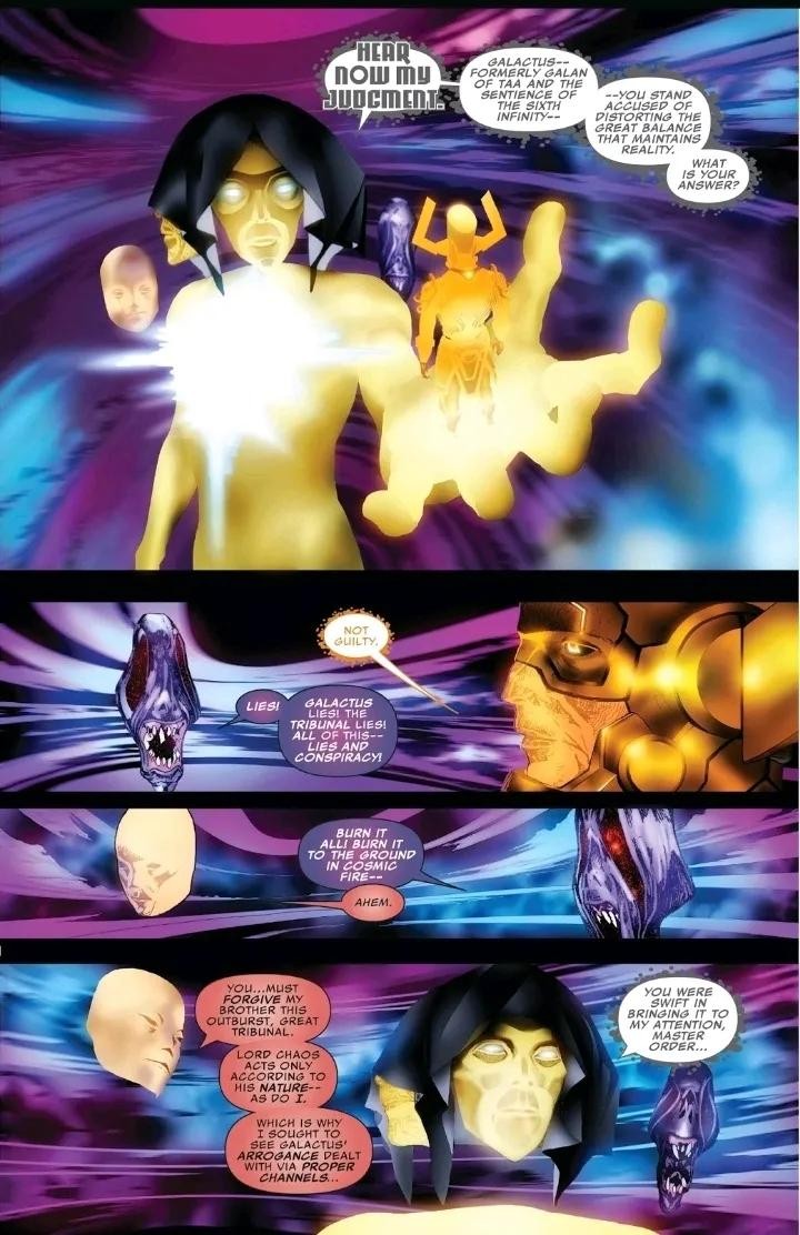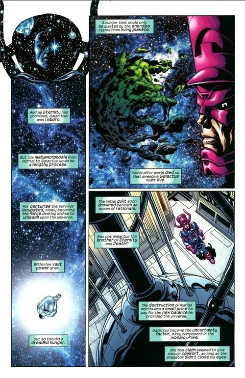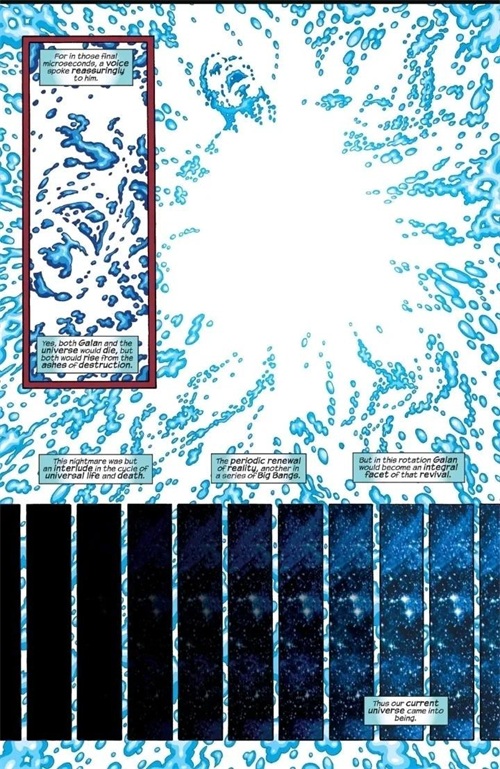 Galan与前一个宇宙的知觉结合,在永恒 的允诺下作为吞星重生;他无止尽的食欲为宇宙带来了平衡。