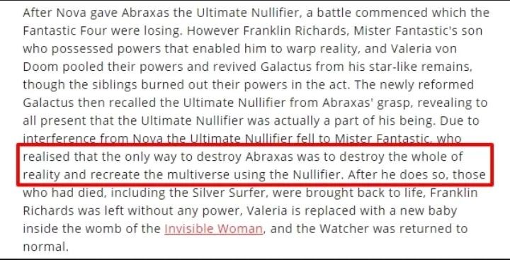 根据Classic Marvel Figurine杂志,Reed使用抹除者重启了多元宇宙,并把神符放回他的永恒盒子。