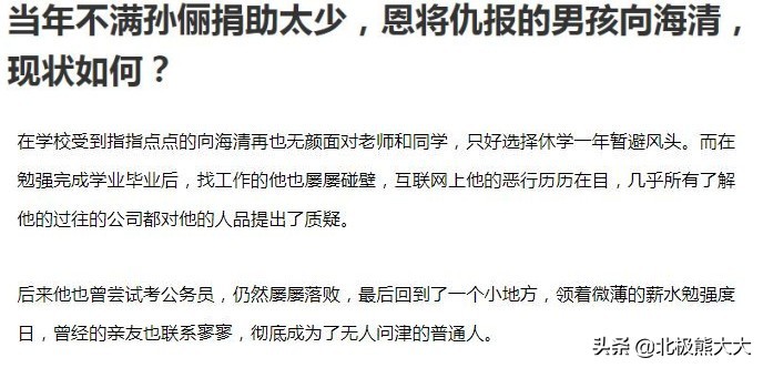 所以从2005年11月开始,孙俪停止了对向海清的资助,并斩断了和他的联系。