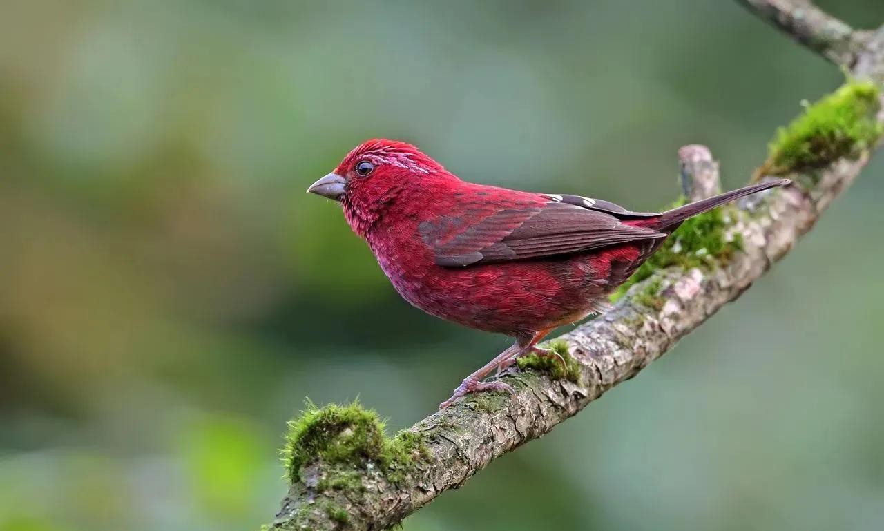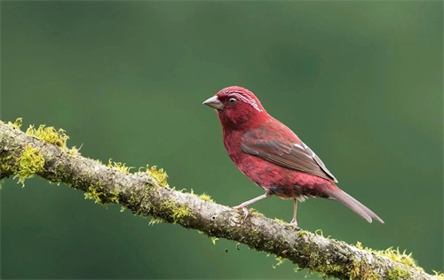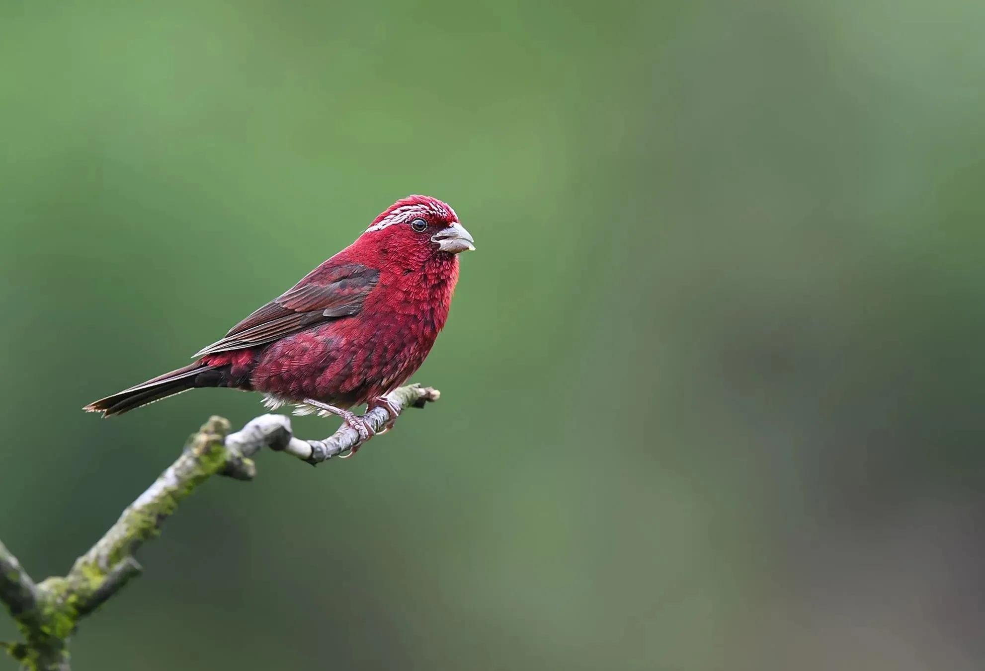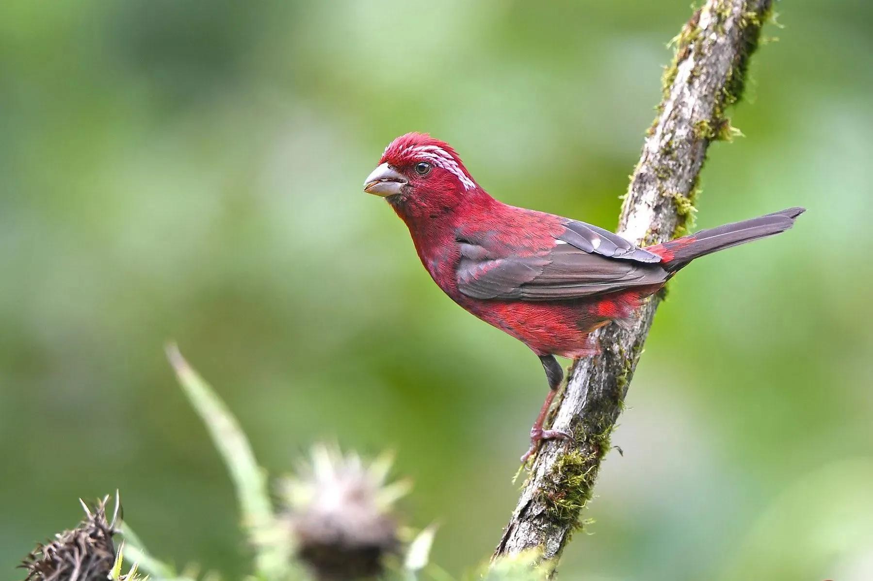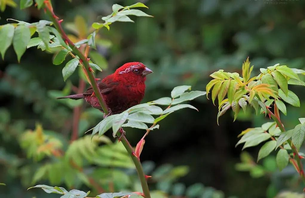 酒红朱雀:雀科朱雀属鸟类,属小型鸟类,体长13-15厘米。雄鸟通体是如同葡萄酒一般的深红色,翅膀和尾巴为褐色,眼睛上方有一抹白色羽毛,一直延伸到脑后,有种飞眉入鬓的感觉。头顶的羽毛可以竖起,竖起时像发怒一样,怒发冲冠。