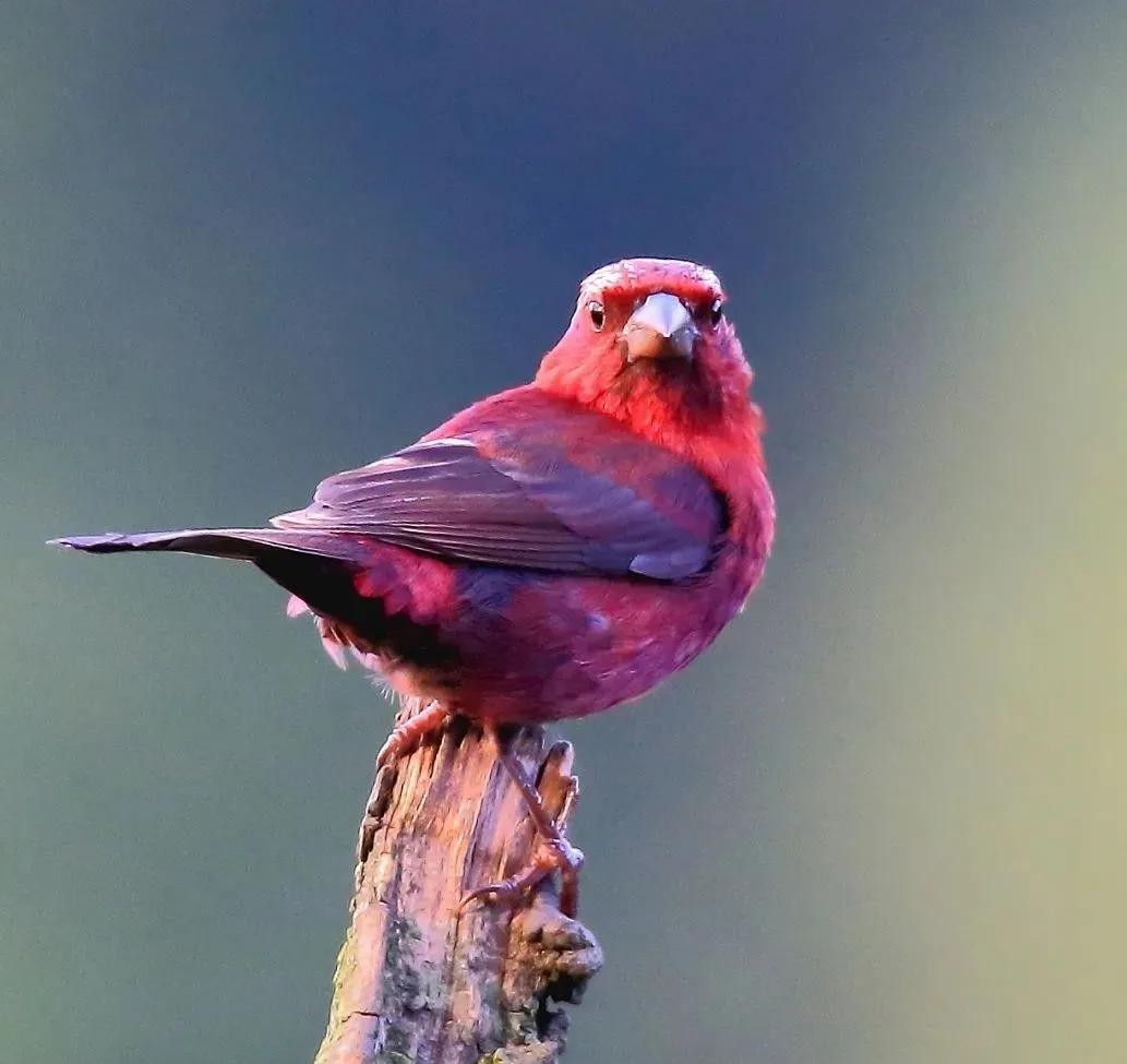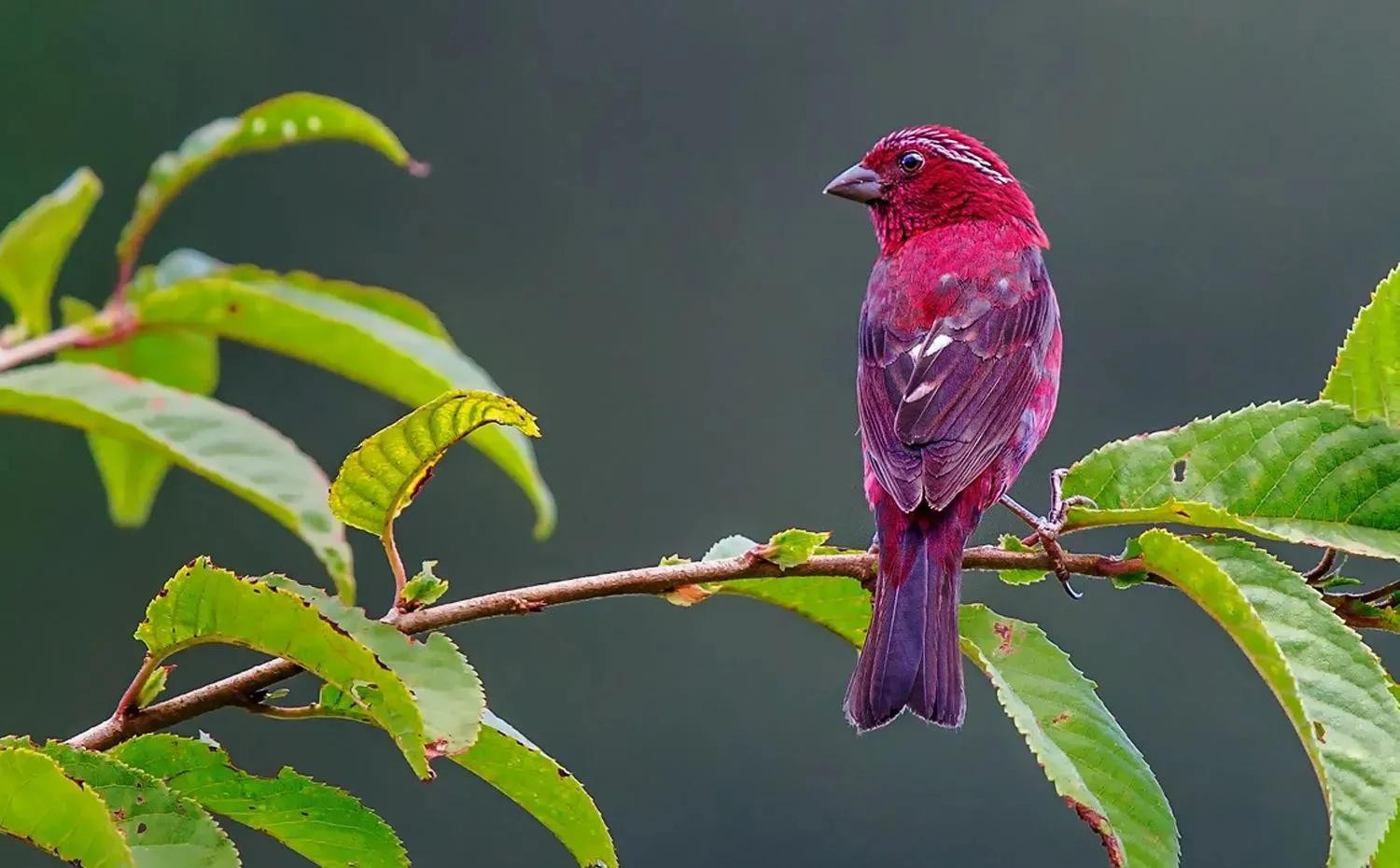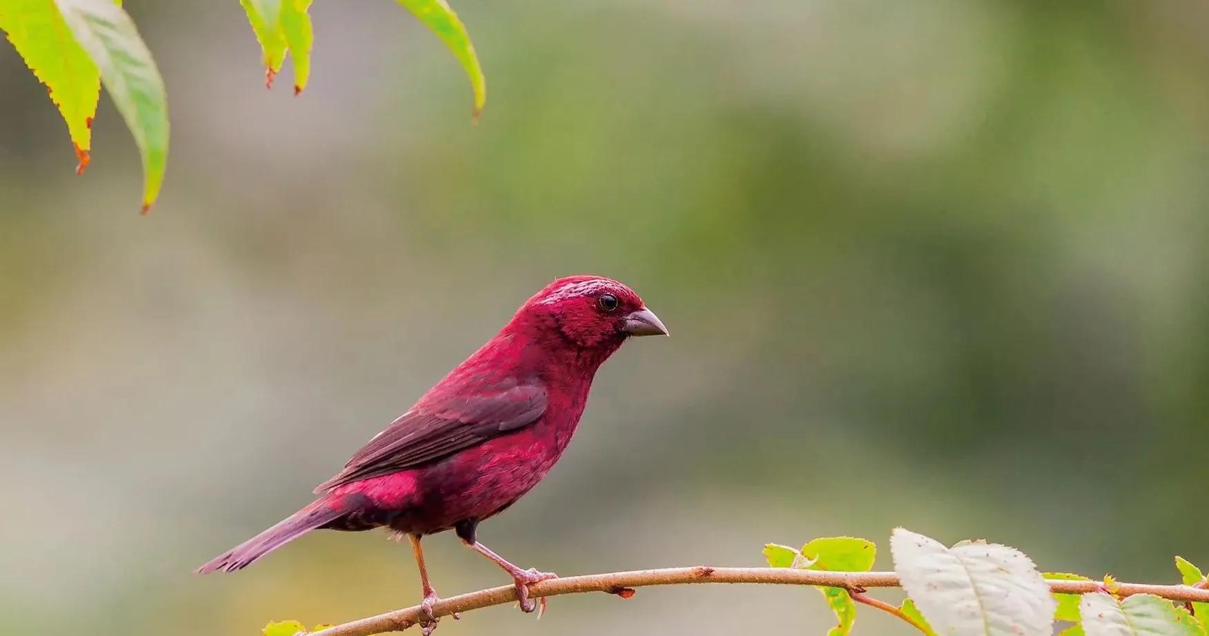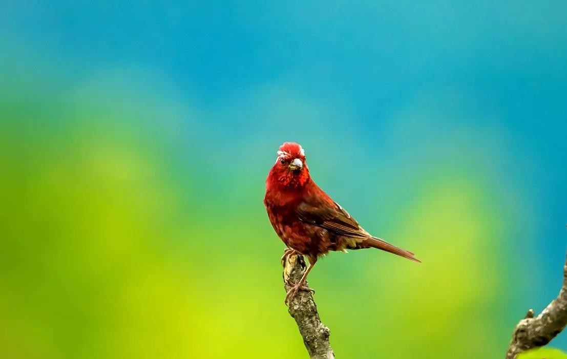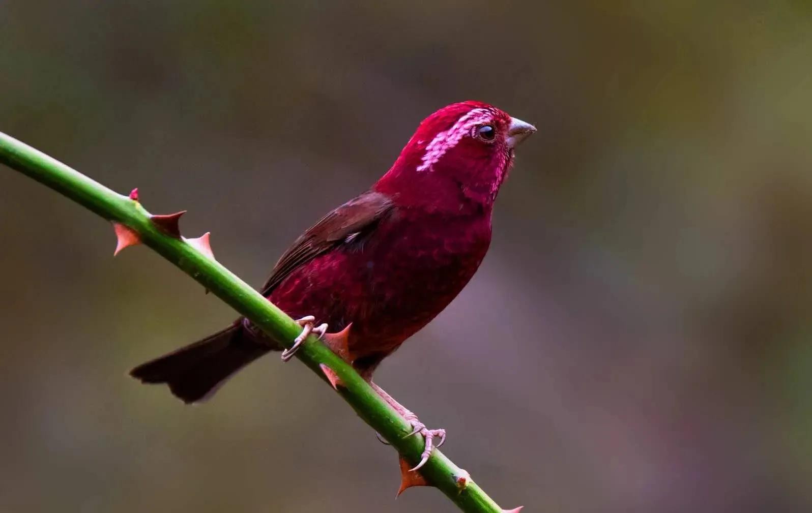 酒红朱雀:雀科朱雀属鸟类,属小型鸟类,体长13-15厘米。雄鸟通体是如同葡萄酒一般的深红色,翅膀和尾巴为褐色,眼睛上方有一抹白色羽毛,一直延伸到脑后,有种飞眉入鬓的感觉。头顶的羽毛可以竖起,竖起时像发怒一样,怒发冲冠。