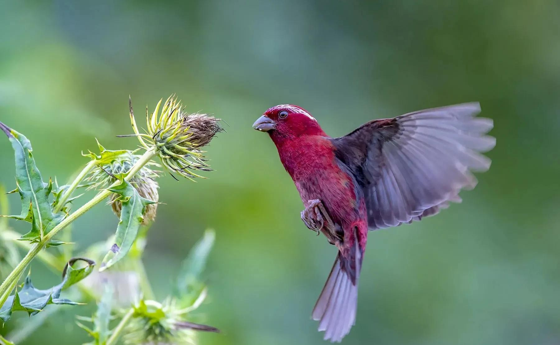 酒红朱雀主要以草籽.果实.种子等植物性食物为主,偶尔也会吃一些昆虫。