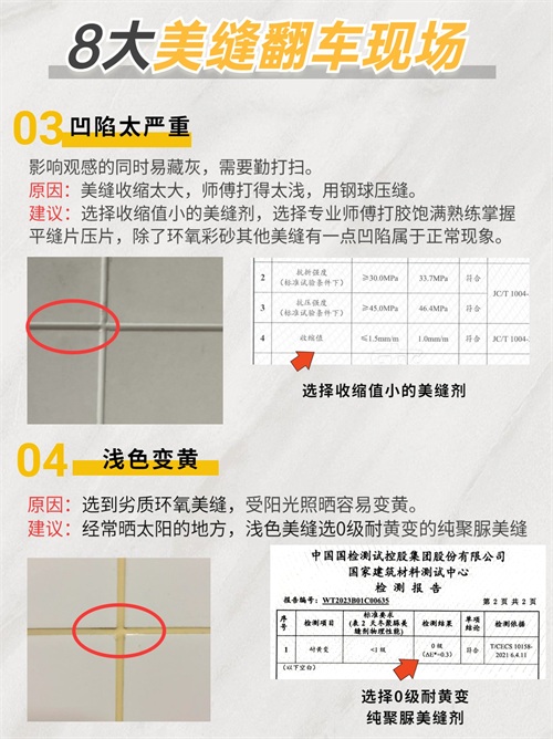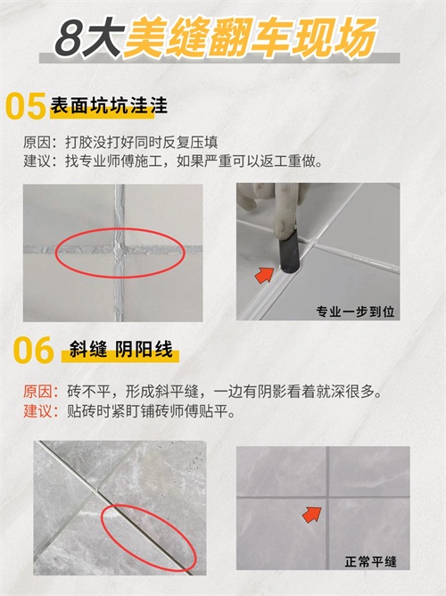 建议:选择收缩值小的美缝剂,选择专业师傅打胶饱满熟练掌握平缝片压片,除了环氧彩砂其他美缝有一点凹陷属于正常现象。