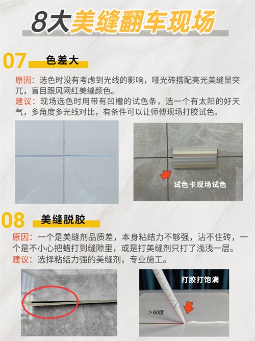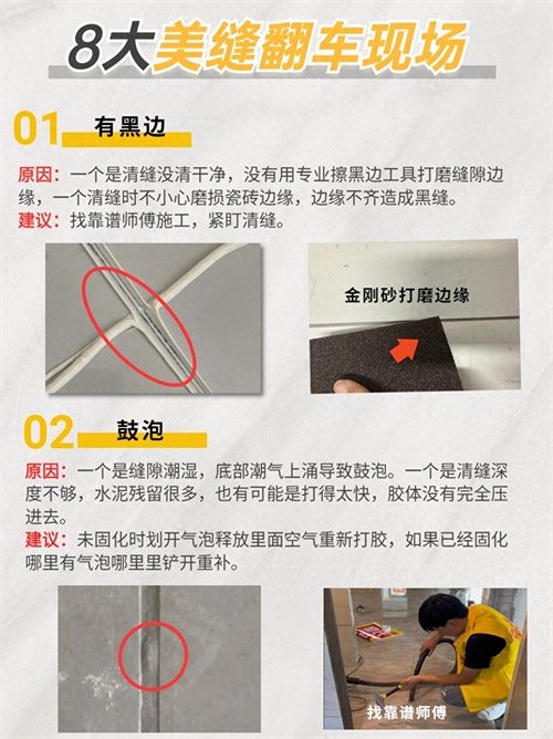建议:选择粘结力强的美缝剂,专业施工。