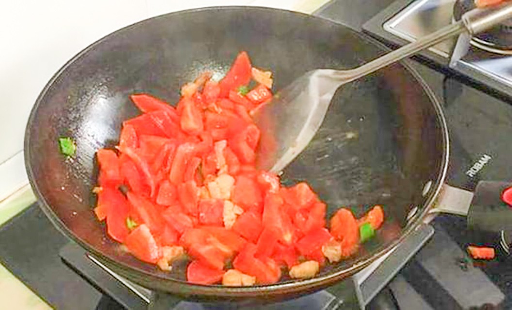1.先煮好汤,边煮边搅面疙瘩,顺便加点蔬菜,我这次放的是西红柿,将西红柿洗净,切好块,然后呢,再来点葱花,蒜的片,起锅倒油,油温差不多时就可以放上葱蒜,给它爆香,接着放上西红柿块,然后加料酒,糖,翻炒出汁。汤汁浓稠时加上番茄酱,再倒点水,用大火,烧开。
