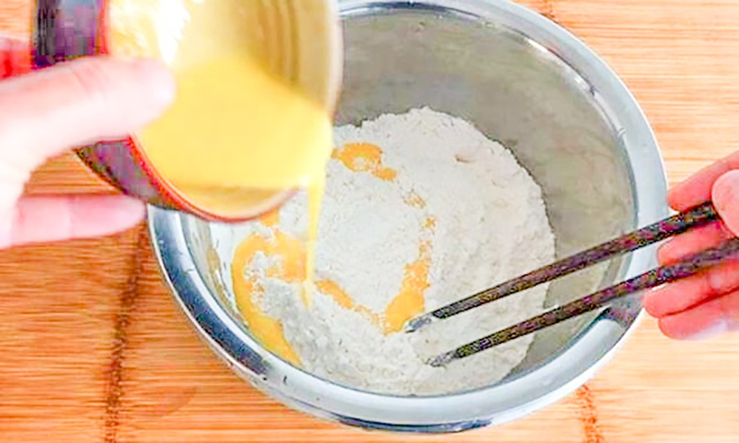 2.然后呢,盆里加上面粉,一般呢就是别人都会加水搅拌,咱们不要加水,直接取一个碗打入鸡蛋并搅散,最后把鸡蛋倒入面粉里,然后用筷子顺一个方向搅拌,这样很快就变成面疙瘩了,吃起来特别的筋道。