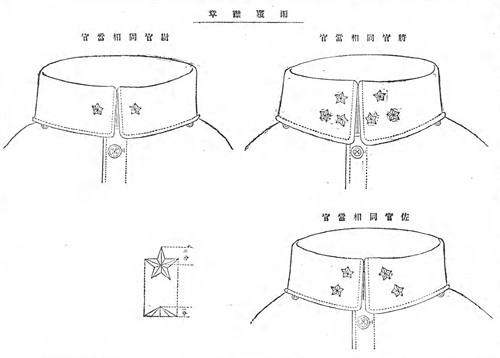 四五式军服使用不同颜色领章代表兵科部,兵科的将军不佩戴领章,部的将军佩戴领章: