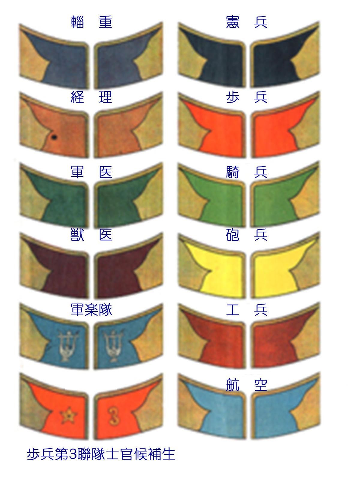 领章样式为锹形。步兵,骑兵,炮兵,工兵,辎重和航空兵(1914年成立)领章为阿拉伯数字队号(联队或大队番号)。台湾歩兵联队的右领章为樱花,左领章为数字队号。临时朝鲜派遣步兵联队的中队右领章为日章和中队队号,左领章为联队队号,。独立守备大队的右右领章为特殊徽章,左领章为大队队号。各兵科下属兵种(比如炮兵的野战炮兵、山炮兵、重炮兵、野战重炮兵、高射炮兵)士兵右领章为兵种徽章,左领章为数字队号。