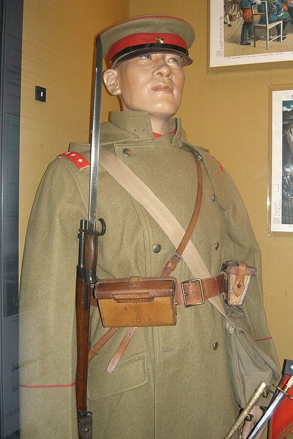 四五式也是日本陆军在和平时期穿的第一套茶褐色(卡其色)面料的军服,并且在军裤用红色条纹作为边缝装饰。