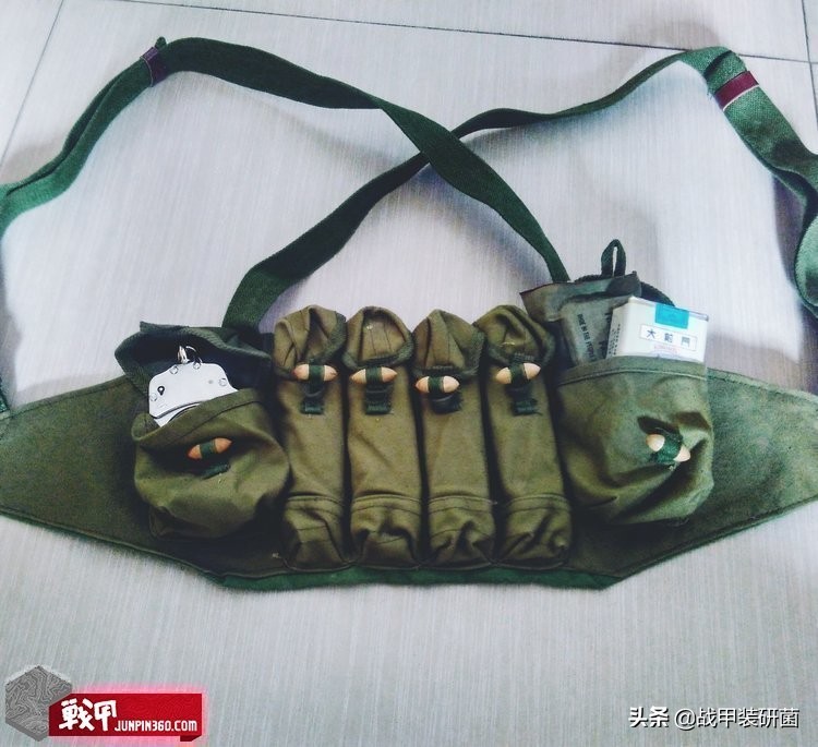 79配属的弹药携行具是胸挂,体积要小于56胸挂,而且两边的小仓比56胸挂少两个(56为4个,79为2个)。有四个装弹匣的长条仓,可以每个可以装下一个79式冲锋枪的弹匣。(各仓内均缝有防水布)这是常见的帆布携行具,类似于56式冲锋枪的携行具,都为X带胸挂。