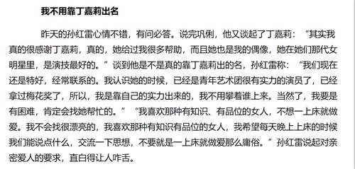 关于这段恋情网上众说纷纭,有说孙红雷借大姐上位,孙红雷对此曾经在2005年回应说:自己认识丁嘉丽的时候,已经拿过梅花奖了,是靠实力出来的,不用靠丁嘉丽出名。