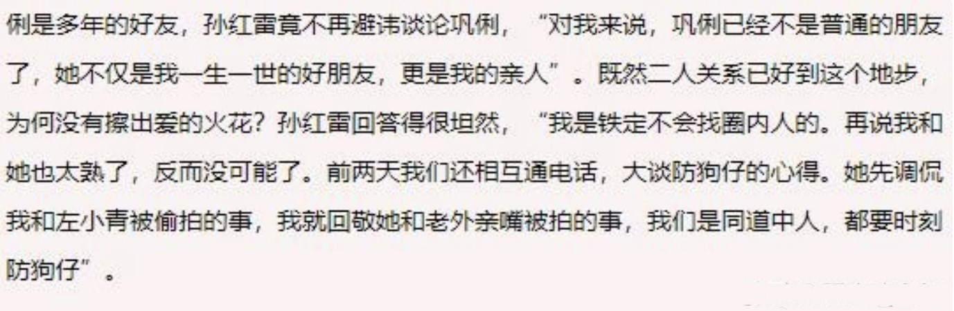 2008年秋天,孙红雷在长春电影节又遇见了巩俐,他告诉巩俐自己已经找到女朋友,他们很相爱。
