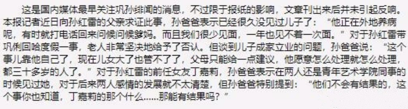 孙红雷和丁嘉丽由于年龄差距的原因被家长反对,最后分手了。孙红雷的爸爸接受采访说:“他们不会有结果的。”