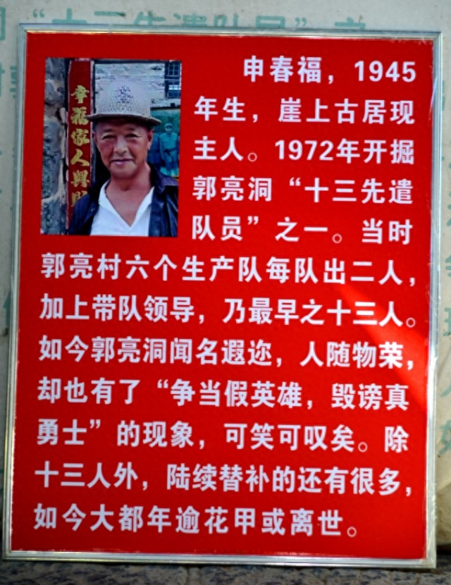 1972年为让乡亲们能走下山,13位村民在老村长申明凯的带领下,卖掉山羊、山药,集资购买钢锤 、钢锉。十三个人用了五年半时间凿成了这条连先辈们想都不敢想的震惊世界的悬崖挂璧公路。五年多的艰苦施工在没有勘探设备的条件下可想而知……