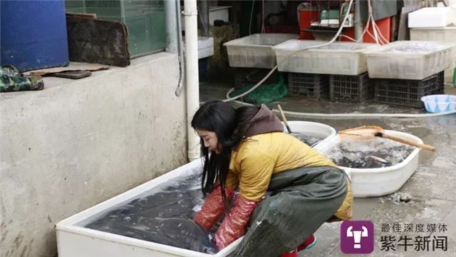 当时,正好一位顾客在鱼摊上买鱼。扬子晚报紫牛新闻记者看到,这位“卖鱼西施”身材有点娇小瘦弱,身高1.6米左右,身上依旧穿着视频中的那身羽绒服和围裙,正热情地向客户推介。一会双方就谈定,只见她利落地从鱼盆里赤手捞起一条青鱼,这条大鱼足有十多斤重,在她手里跳来跳去,差点滑落到地上。