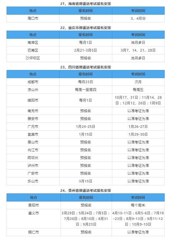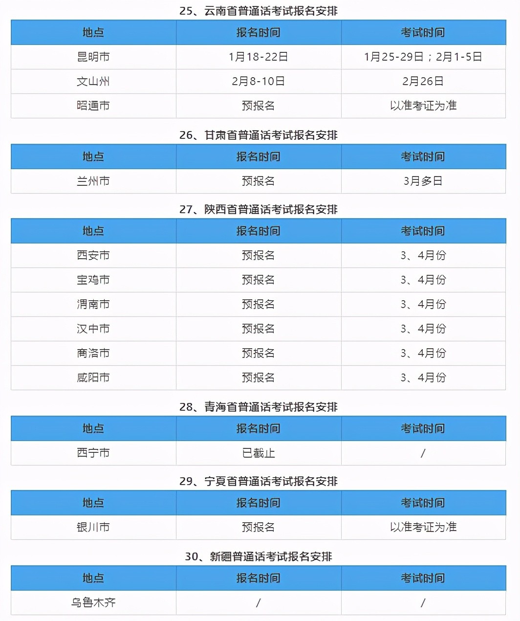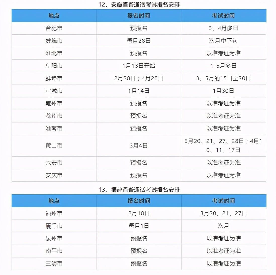 安徽省:合肥(预报名)、蚌埠(每月28日)、阜阳(1月13日)、蚌埠(2月28日;4月28日)、宣城(1月14日)、淮北(预报名)、亳州(预报名)、滁州(预报名)、淮南(预报名)、黄山(3月4日)、六安(预报名)、安庆(预报名)