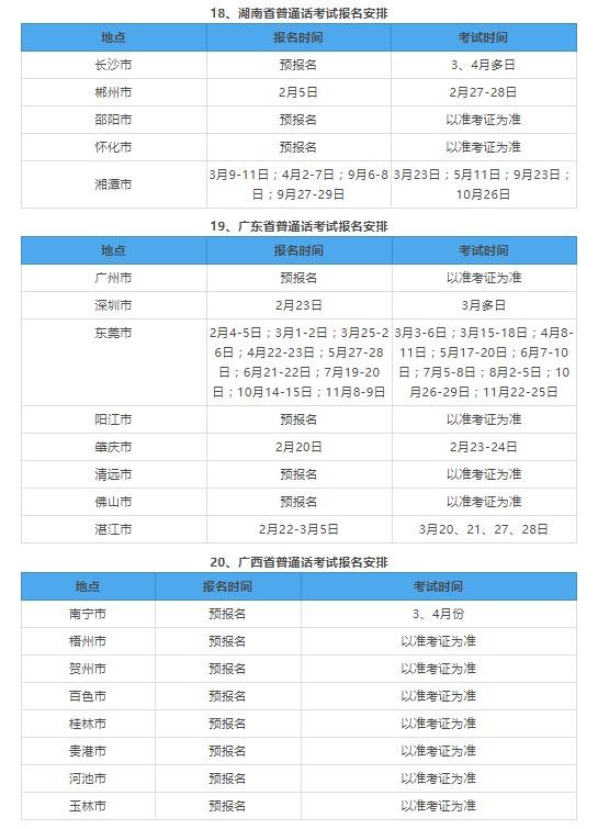湖南省:长沙(预报名)、郴州(2月5日)、邵阳(预报名)、怀化(预报名)、湘潭(3月9-11日;4月2-7日;9月6-8日;9月27-29日)