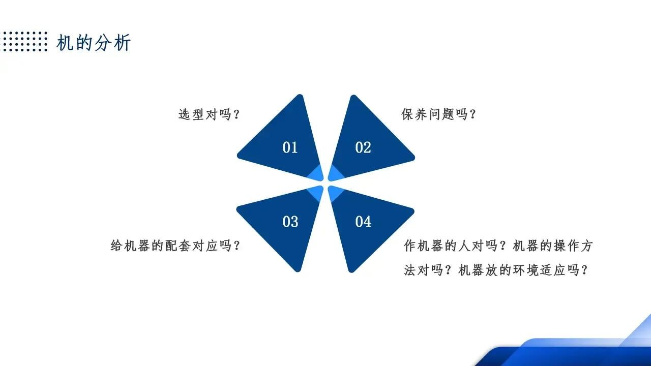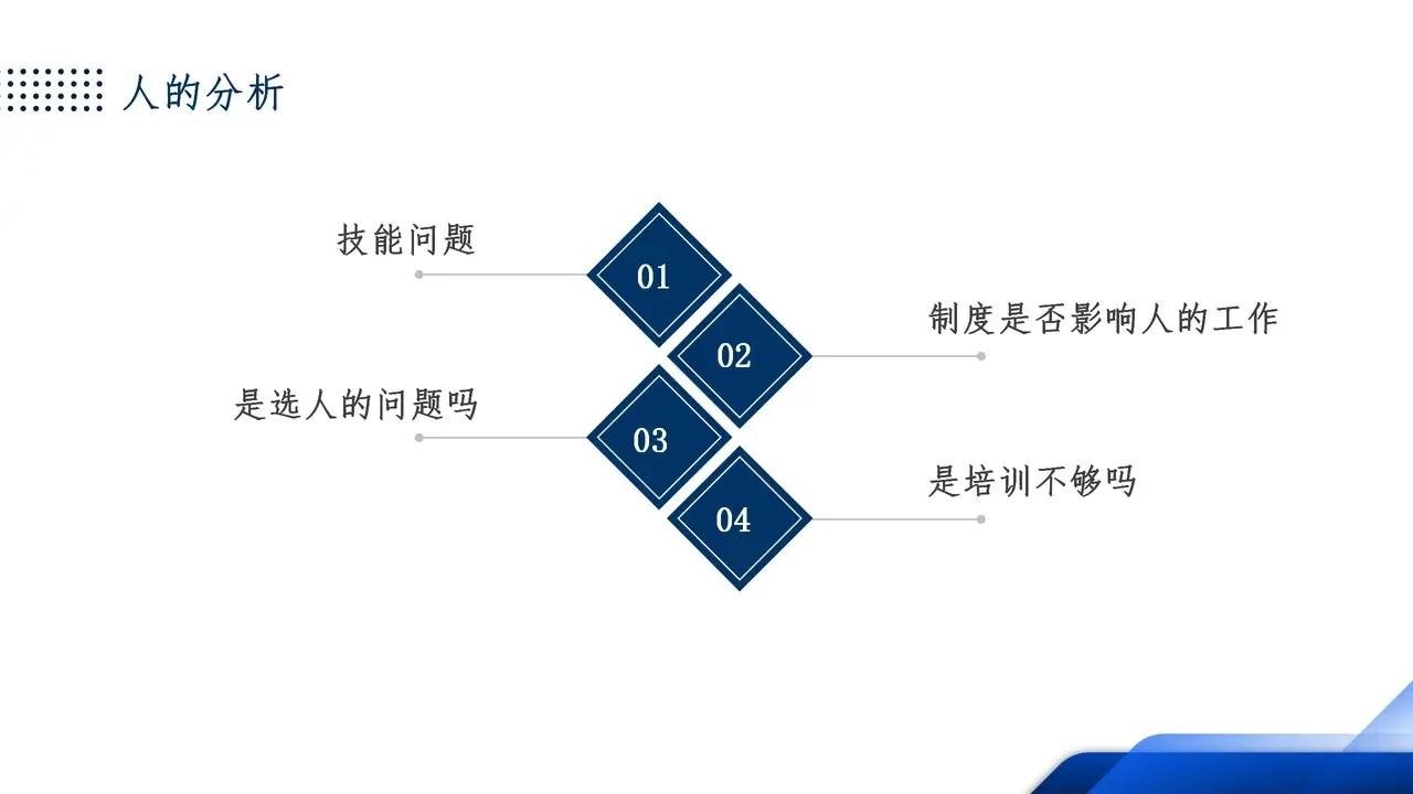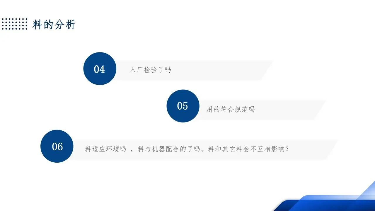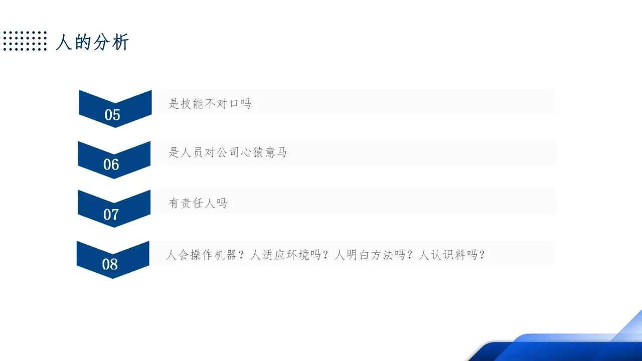 人机料法环的分析是对生产现场的五个关键因素进行全面分析,旨在优化生产流程、提高生产效率和质量。人机料法环包括:人员、机器、物料、方法、环境。通过对这五个方面的分析,可以找出生产过程中的瓶颈和问题,并采取相应的措施进行改进。