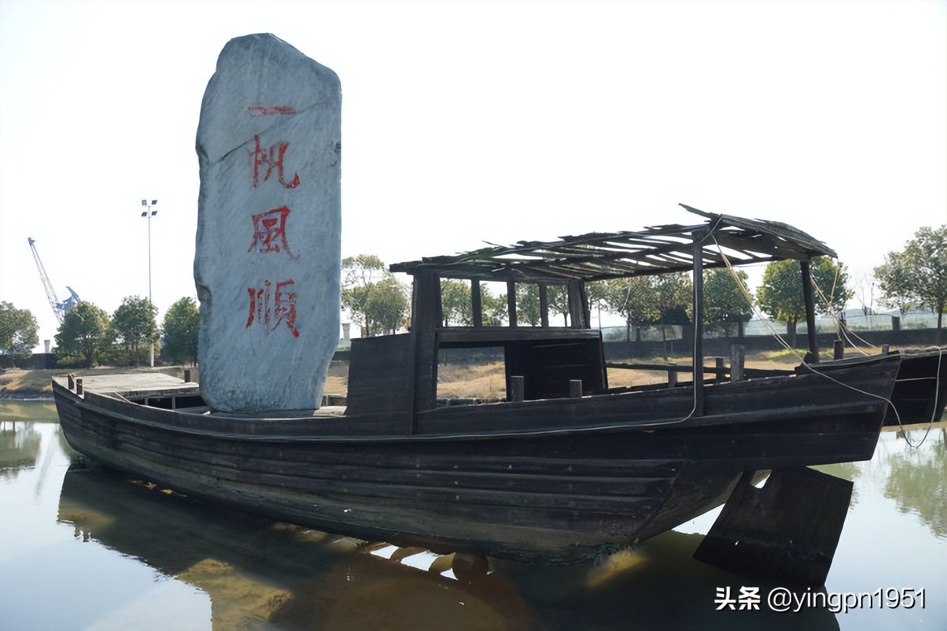 刻有“一帆风顺”四个大字的石帆,是从广西运来的一块高8米、宽3米、厚0.4米、重约50吨的“水冲石”。