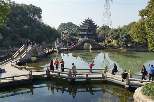整个古生态园区湖水与古桥相亲、古桥与亭台相连、亭台与古树相依、古树与花草相伴。