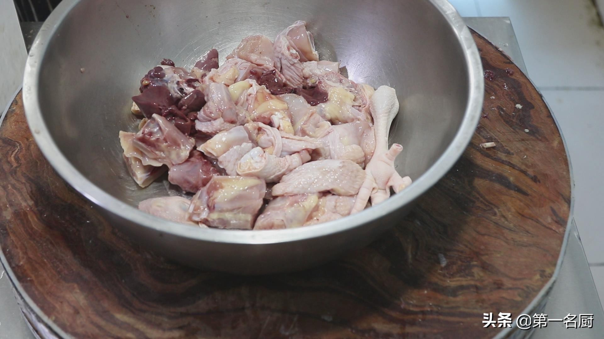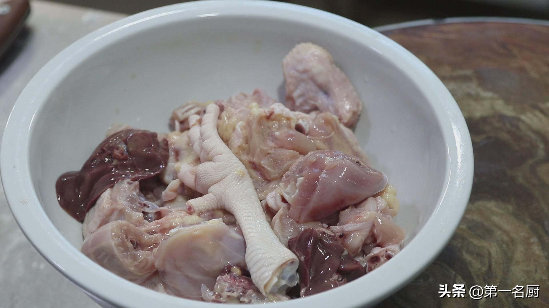 准备三黄鸡半只,先切掉腔上囊,也就是鸡屁股,再去除鸡脖子里面的淋巴,斩成小段,接着把鸡肺去掉,切成大小均等的鸡块,放入盆中,如果想省事,可以让卖鸡肉的帮忙剁好。
