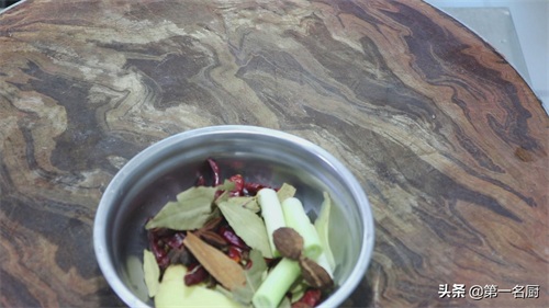 准备生姜一小块,切成薄片,放入盆中,再抓入红干椒一小把,花椒几粒,八角两个,桂皮一小块,香叶几片,草果一个。