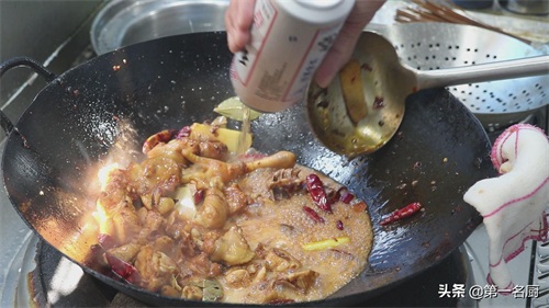 10分钟以后开始调味,加入鸡粉3克,搅拌化开,开大火慢慢收干汤汁,捡出大料,避免影响口感。