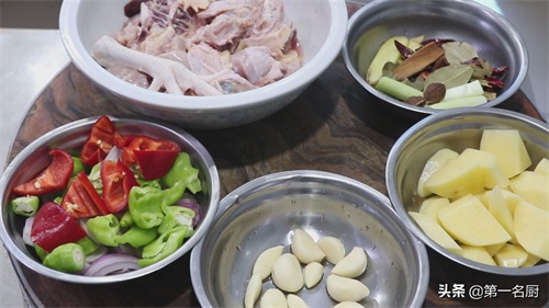 食材:三黄鸡,洋葱,生姜,青红椒,大蒜,土豆