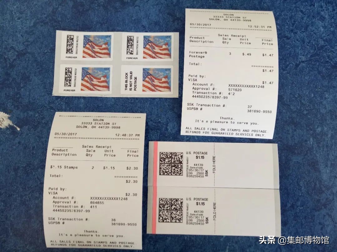 笔者在自助服务系统上按提示购买了2枚面值1.15美元的邮资签条和3枚价格0.49美元的永久邮票,使用中国银行信用卡付费,以美元结算,十分便捷,系统还打印出相关收据(图8)。