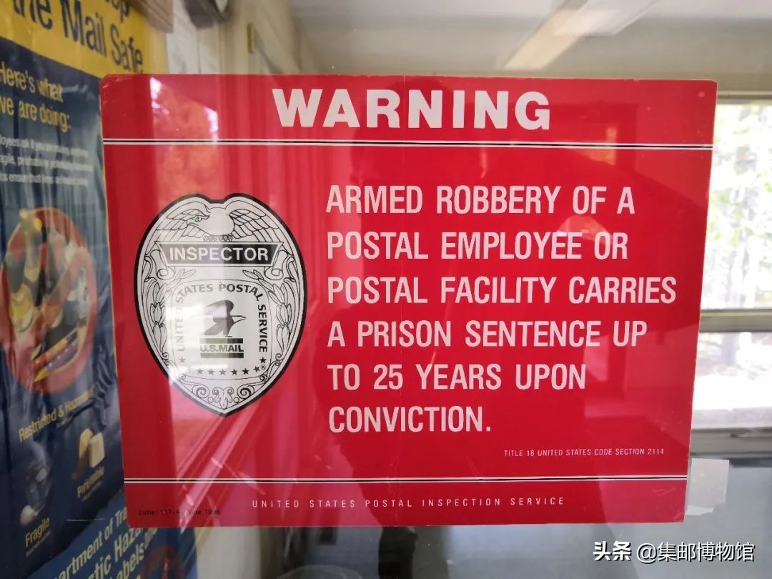 邮局内还有美国邮政监察局红色的警示语:持械抢劫邮政工作人员或邮政设施一经定罪最高可判25年徒刑(图16)。