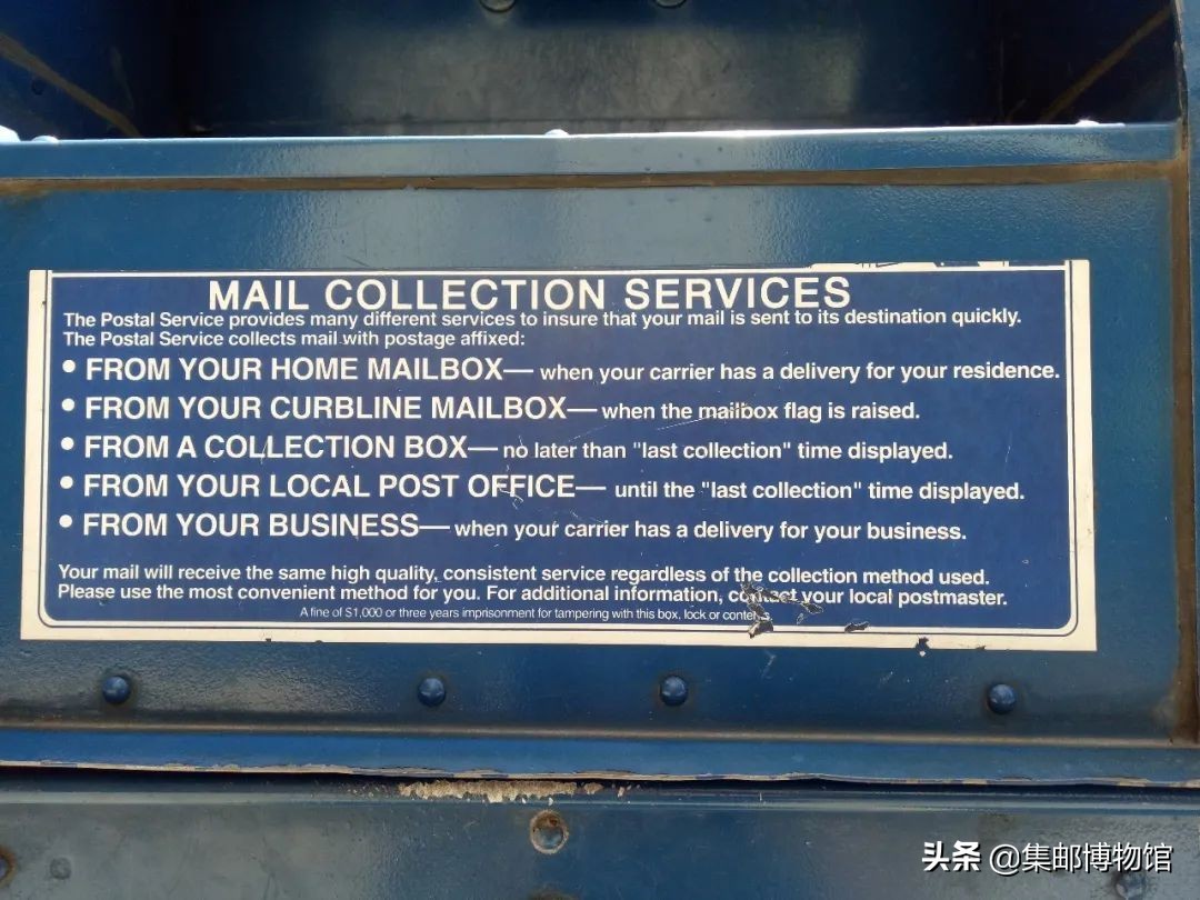 贴好邮票的信件有5种取件方式:取自您家中的信箱;取自您的路边信箱;取自公共信箱;取自您所在邮局的信箱;取自您的办公场所,广告牌在最下端注明“故意破坏信箱、锁等公共设施将被处以罚款1000美元或判处3年监禁” (图5)。
