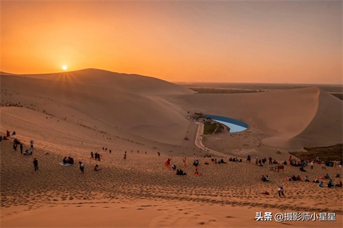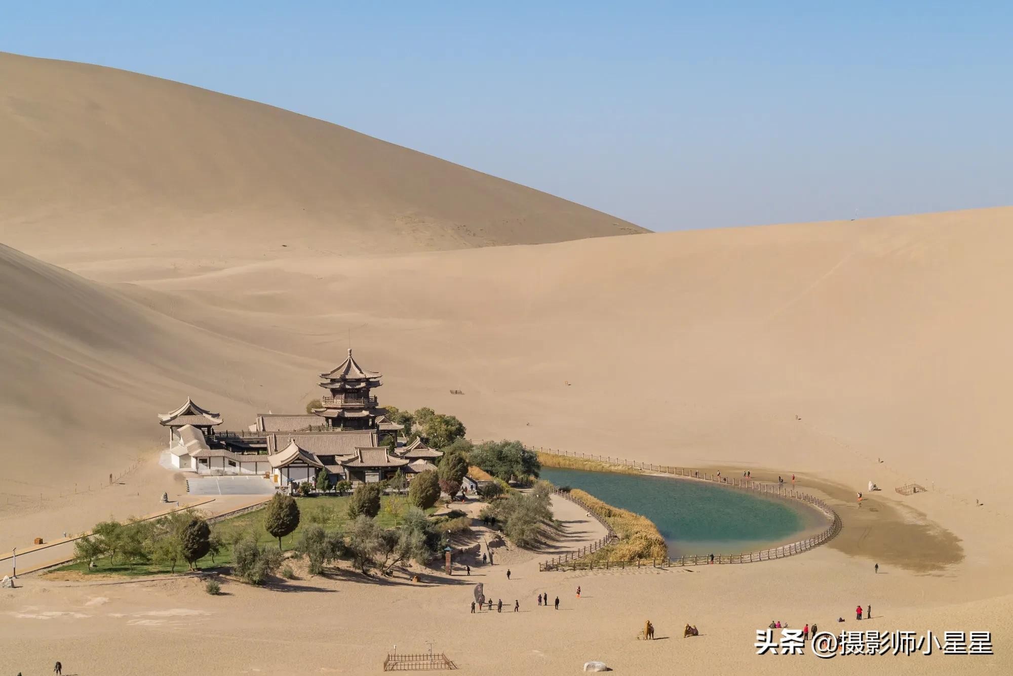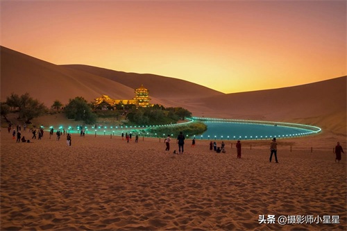 在大漠深处,鸣沙山静默而神秘,沙丘起伏,形态各异。当微风吹过,沙粒随风飘舞,发出悠扬的鸣响,如同古老的乐器在低吟浅唱。而月牙泉则像一颗璀璨的明珠,镶嵌在这金色的画卷中,清澈见底,与鸣沙山相映成趣。
