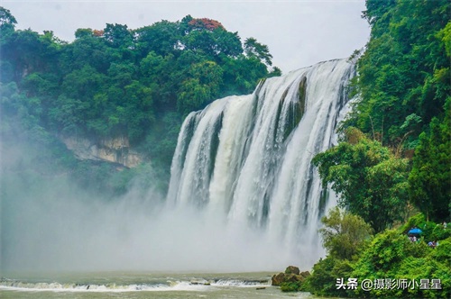 黄果树瀑布不仅气势磅礴,更有着无尽的韵味。那层层叠叠的瀑布群,如同一首首激越的交响乐章,奏响着大自然的壮丽与激情。而周围的绿树红花,更为这壮丽的瀑布增添了几分柔美与宁静。