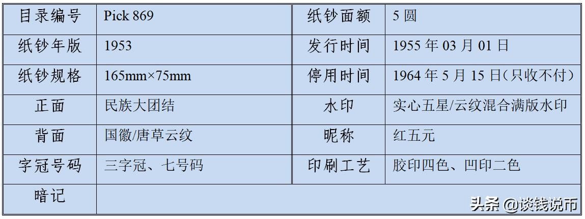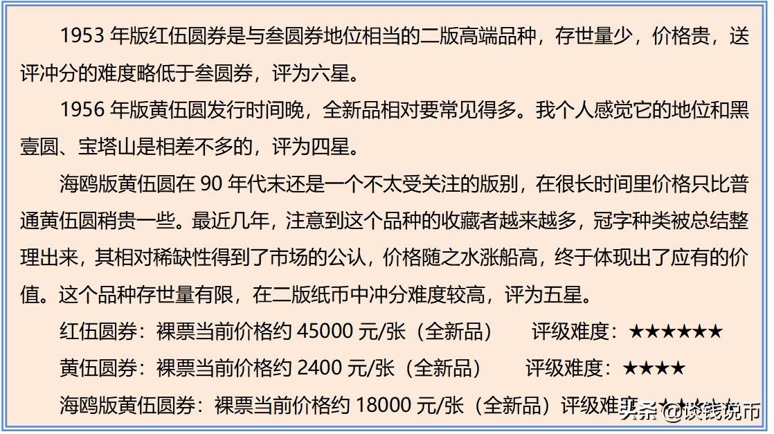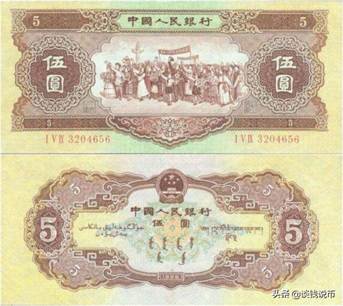 第一种版别是苏联印刷的1953年版伍圆券,使用实心五星/云纹混合水印纸印刷,票面颜色偏红,俗称“红伍圆”,于1955年3月1日开始发行流通。这种5元由苏联代印,与三元,十元统称“苏三币”,由于上世纪60年代中苏关系恶化,1964年4月14日,中国人民银行发布《关于收回三种人民币票券的通告》,决定从1964年4月15日开始限期收回苏联代印的1953年版的3元、5元和10元券。1964年5月15日,“苏三币”停止收兑和流通使用。第二种版别是国内印刷的1956年版伍圆券,俗称“黄伍圆”,使用空心五星水印纸印刷,于1962年4月20日开始发行流通。第三种版别是在1956版黄伍圆券中,有一部分是采用实心五星/云纹混合水印钞票纸印刷,印量很少,只印满了两个冠字组,是个相对稀少的品种。这种版别因为云纹水印的形状有点象海鸥展翅,所以也被称为“海鸥伍圆”。 其实“海鸥伍圆”也是黄伍元的一种,只有水印纸的区别,算是钱币收藏界自己统计出来的一个小品种,克劳斯目录没单独编号。1953年版红伍圆券的情况与叁圆券相同,都是在1953年10月签订合同委托苏联印刷的。订货量起初是5亿张,只相当于叁圆券订货量的一半。但在1954年5月,我国根据流通中的实际需求,又追加订货了4亿张红伍圆券,使得它的订货总量达到了9亿张,与叁圆券订货量10亿张已经相差无几了。到1955年底,合同执行完毕,苏联共向我国实际交付1953年版红伍圆券9亿零800万张,略少于叁圆券的实际印量10亿3095万张。