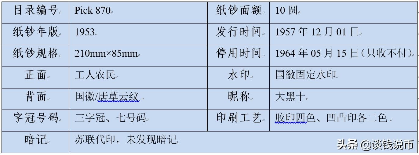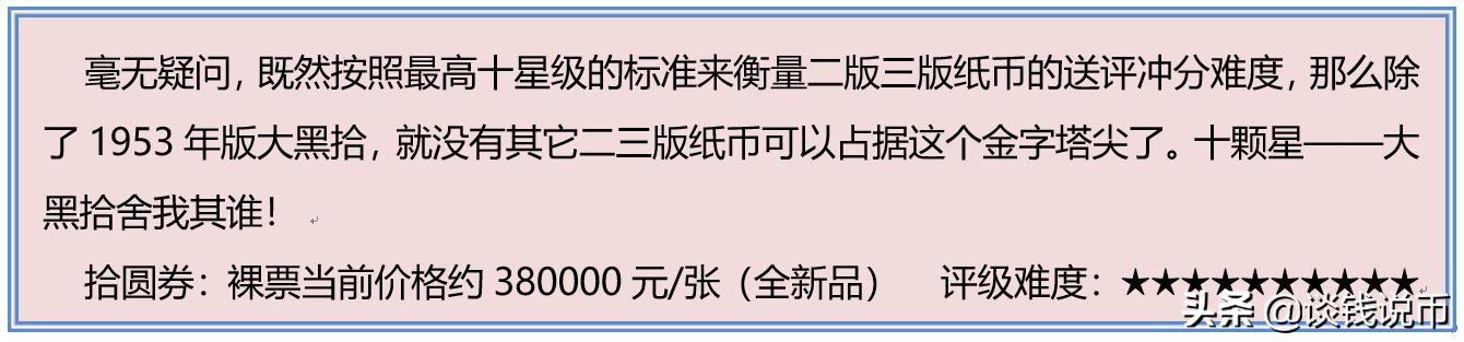 1964年4月15日,按照央行《关于收回三种人民币票券的通告》,1953年版拾圆券与叁圆、伍圆券一起被迅速回收。作为当时人民币最大面额的钞票,拾圆券的购买力非常之大,可以维持普通家庭一个月的基本生活,所以很少有人保留它而不去银行兑换的。在当前纸币收藏品市场上,大黑拾纸币一票难求,报价高达三十余万元也难以寻购到真正的全新品相裸票,是二版纸币中送评冲分难度最大的顶尖品种。
