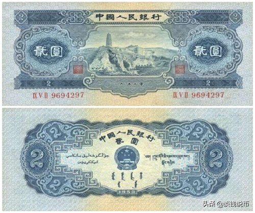 贰圆券1955年3月1日开始发行流通,采用苏联特2号水印纸印刷。贰圆券只有一种版别,正面主图为“延安宝塔山”,与壹圆券的“北京天安门”和叁圆券的“井冈山龙源口”配套,同属“革命圣地”的系列题材。
