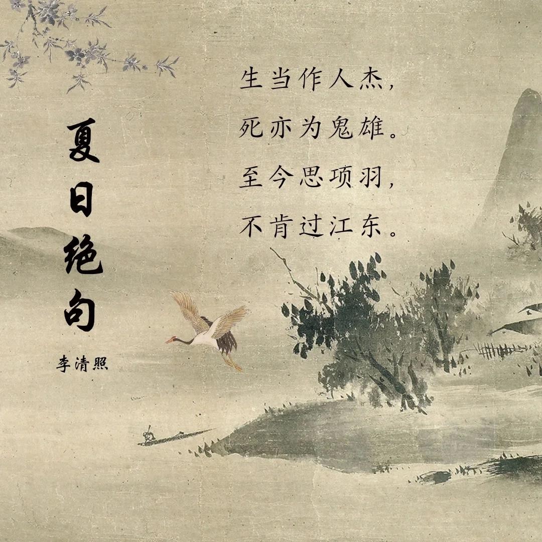 前两句“生当作人杰,死亦为鬼雄”直抒胸臆,表达出一种人生观。人活着就要做人中的豪杰,为国家建功立业;死也要为国捐躯,成为鬼中的英雄。这两句诗以磅礴的气势开篇,表现出诗人对英雄豪杰的崇敬以及对人生价值的积极思考。这种价值观超越了个人的生死,体现出一种崇高的精神境界。 后两句“至今思项羽,不肯过江东”运用了项羽的典故。项羽在楚汉相争中兵败垓下,本可渡江逃生,却因无颜见江东父老而自刎乌江。李清照在此处提到项羽,是因为当时南宋朝廷偏安一隅,面对金兵的入侵不思抵抗。