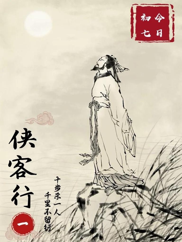 《侠客行》是唐代诗人李白的一首描写和歌颂侠客精神的诗作。 诗的开篇便描绘出一个英武豪迈的侠客形象。“赵客缦胡缨,吴钩霜雪明。银鞍照白马,飒沓如流星。”这些诗句从侠客的装束、武器、坐骑等方面入手,勾勒出一个潇洒、矫健且装备精良的侠客形象。他的动作迅猛如流星,展示出其不凡的身手,这种形象是唐代人对侠客理想化的呈现,反映了当时社会对侠义精神的崇尚。 “十步杀一人,千里不留行。事了拂衣去,深藏身与名。”这几句是对侠客侠义行为和高尚品德的高度概括。侠客武艺高强,杀人于瞬间,却不为名利所累,在完成侠义之事后悄然离去,不图回报。这种侠义精神是一种纯粹的、超功利的正义之举,是对传统儒家道德观念中“重义轻利”思想的一种浪漫化诠释。