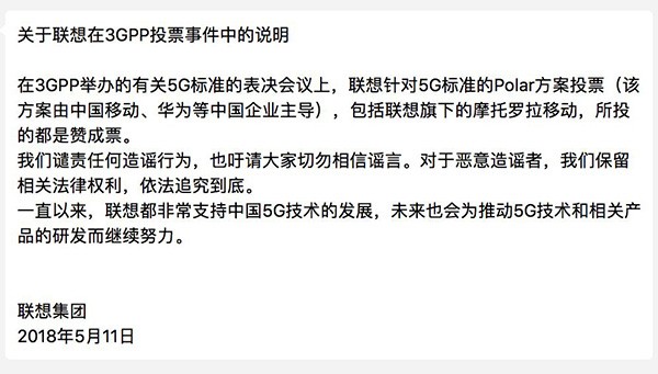 5月11日,联想集团发布澄清公告称,在3GPP举办的有关5G标准的表决会议上,联想针对5G标准的Polar方案投票(该方案由中国移动、华为等中国企业主导),包括联想旗下的摩托罗拉移动,所投的都是赞成票,“我们谴责任何造谣行为,也吁请大家切勿相信谣言。对于恶意造谣者,我们保留相关法律权利,依法追究到底。”