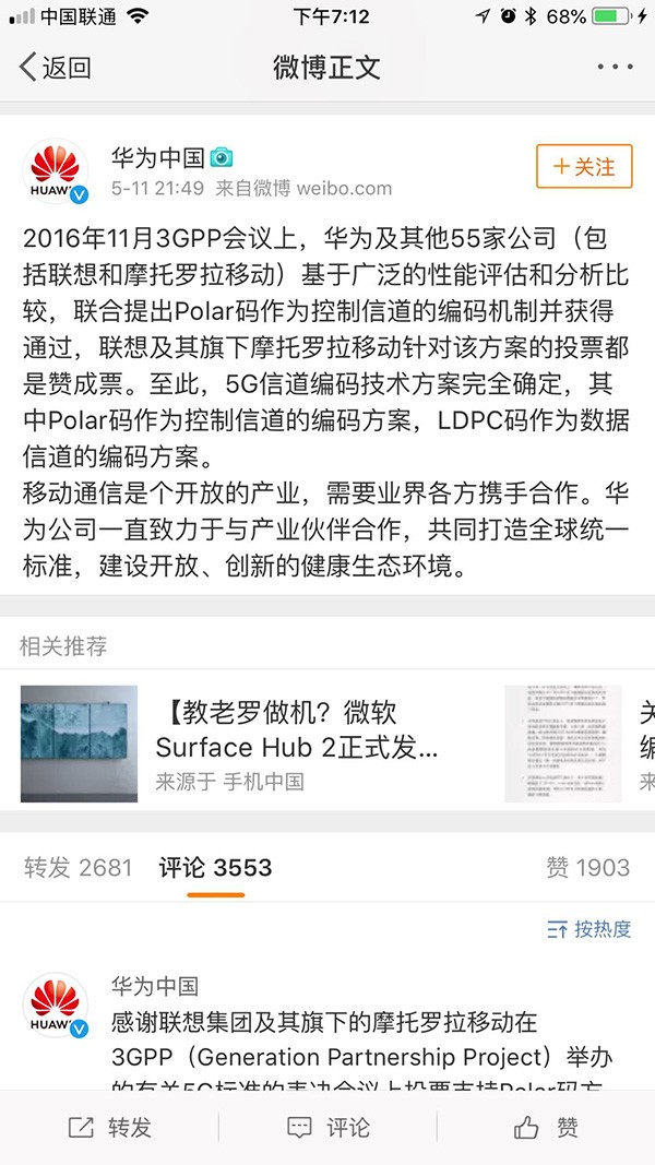 5月11日晚,华为中国区官方微博发文进行澄清。但华为也只强调了联想在控制信道方案上对华为的支持,并未提及联想在数据信道短码上的态度:“2016年11月3GPP会议上,华为及其他55家公司(包括联想和摩托罗拉移动)基于广泛的性能评估和分析比较,联合提出Polar码作为控制信道的编码机制并获得通过,联想及其旗下摩托罗拉移动针对该方案的投票都是赞成票。”