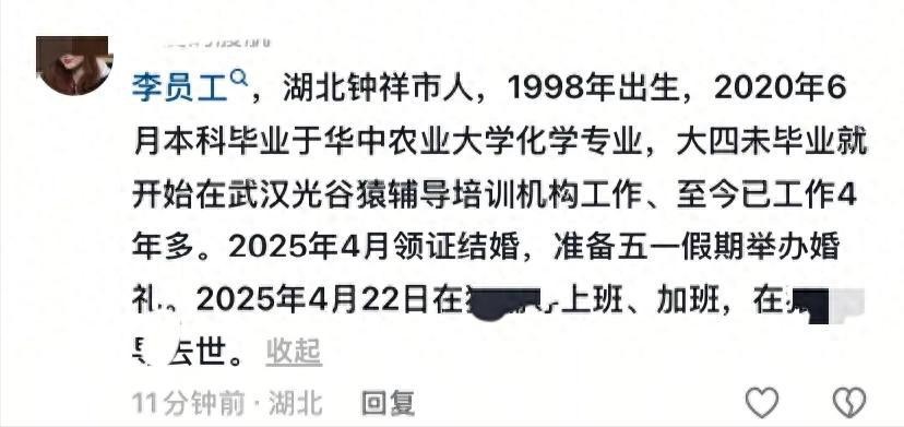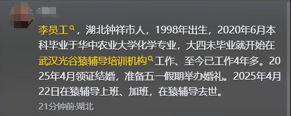 这位华中农业大学毕业生,猿辅导武汉公司员工,在婚礼前夕因过度加班猝然离世,留下未婚妻和家人悲痛欲绝......