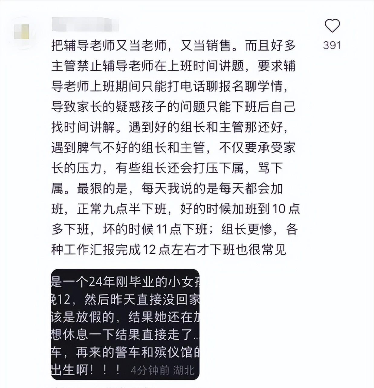 王女士也是够惨的,本身组长的工作就已经非常忙了,下班还要当客服服务学生家长,甚至还要担任销售,下班时间都还要工作,没有一点自己的时间。