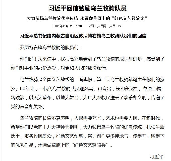 习近平在回信中说,从来信中,我很高兴地看到了乌兰牧骑的成长与进步,感受到了你们对事业的那份热爱,对党和人民的那份深情。
