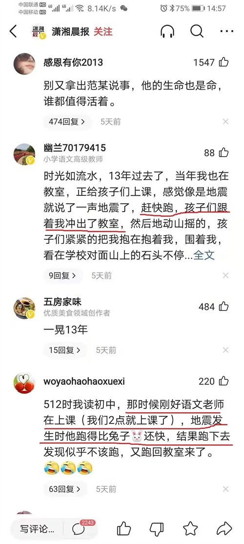 在范美忠的那篇《那一刻地动山摇》中,他这样写道: