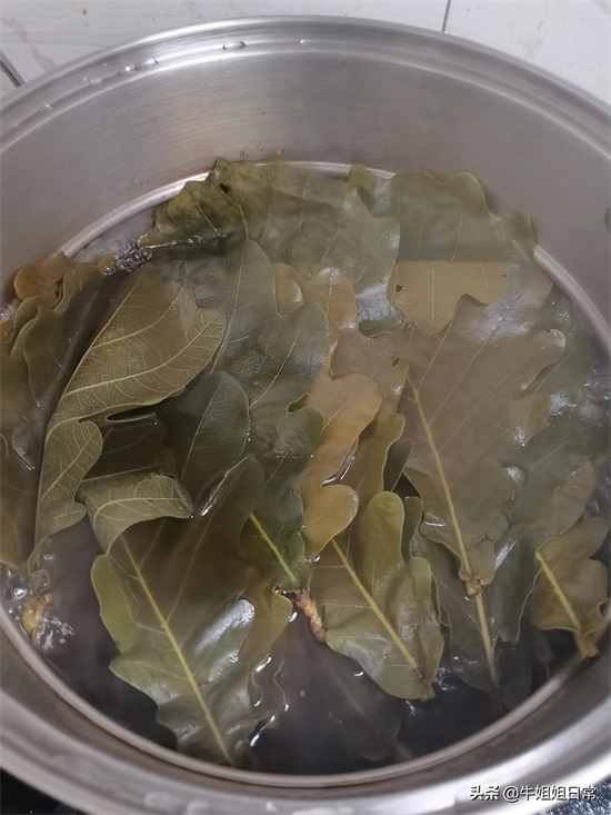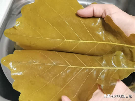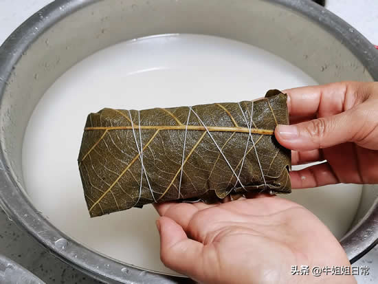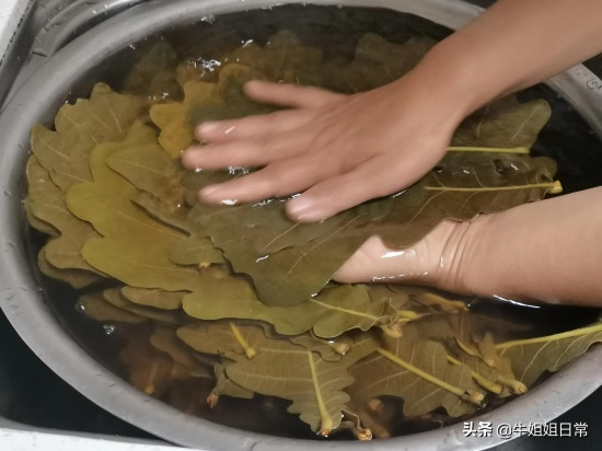 搓洗粽叶:盆内加满水,把煮过的粽叶放入,如图,正面对搓,边搓边洗,全部搓完后,用清水冲两遍。